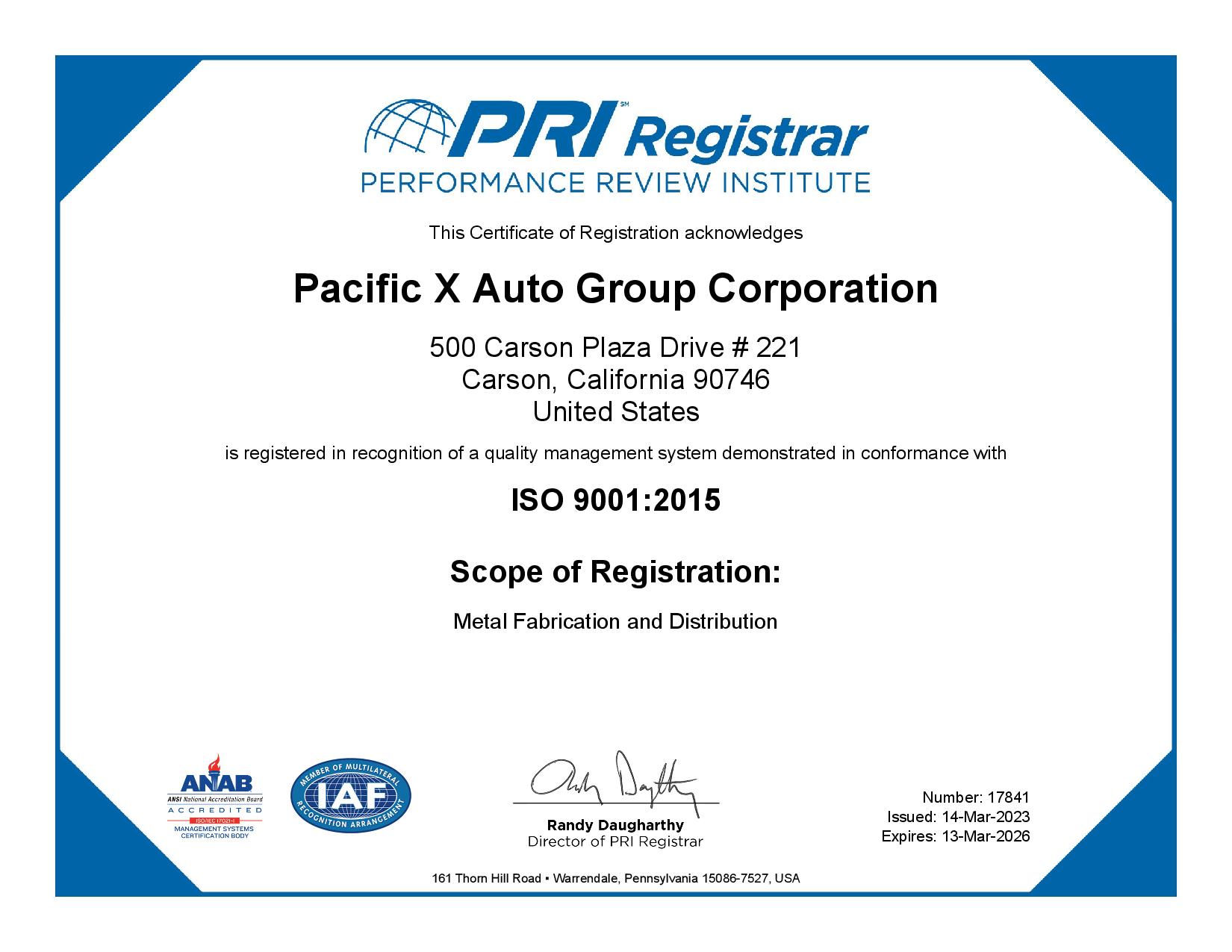 Pacific X Auto Corporation has a ISO9001:2015 Certified Quality Management System.